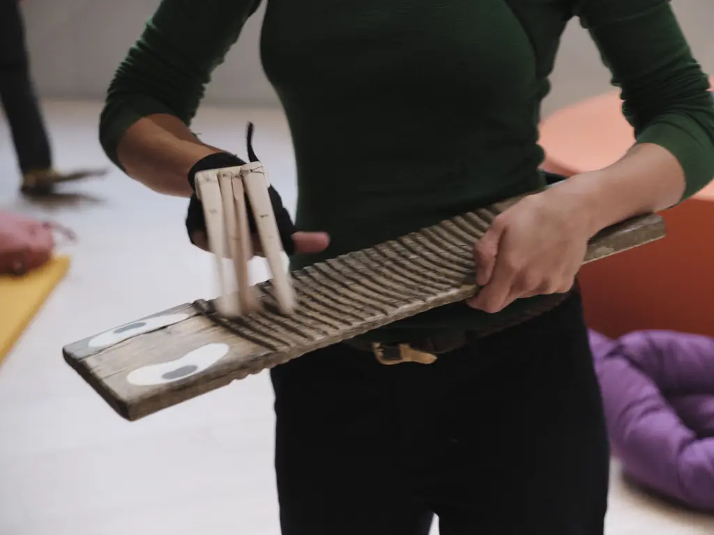 The Score of Things door Emilija Filipenkovaitė is een participatief muziekspel waarbij het toeval bepaalt welke rol elke deelnemer krijgt en hoe een gedeelde partituur wordt geïnterpreteerd. Onder leiding van een willekeurig gekozen dirigent vormen bezoekers tijdelijke ensembles waarbij ze kostuums en rekwisieten uit de tentoonstelling als instrumenten gebruiken. Elke deelnemer trekt een kaart waarop een kostuumelement staat en een manier om dit te activeren door middel van beweging, gebaren of subtiele stemgeluiden. Samen voeren ze een kort geïmproviseerd stuk uit dat uitnodigt tot collectief spelen en luisteren, waardoor de tentoonstellingselementen veranderen in een levend, ademend orkest.